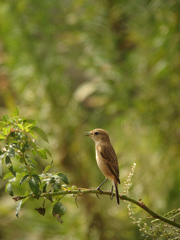 続いて離れたノバラにとまった褐色の小鳥は・・・ノビタキです。
