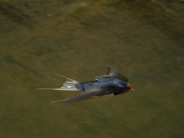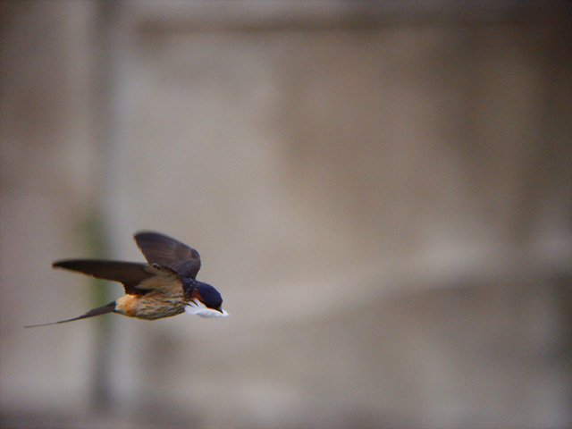 巣材(羽毛?)を運ぶコシアカツバメ。薄暗かった為か、だいぶノイジーな画像です。