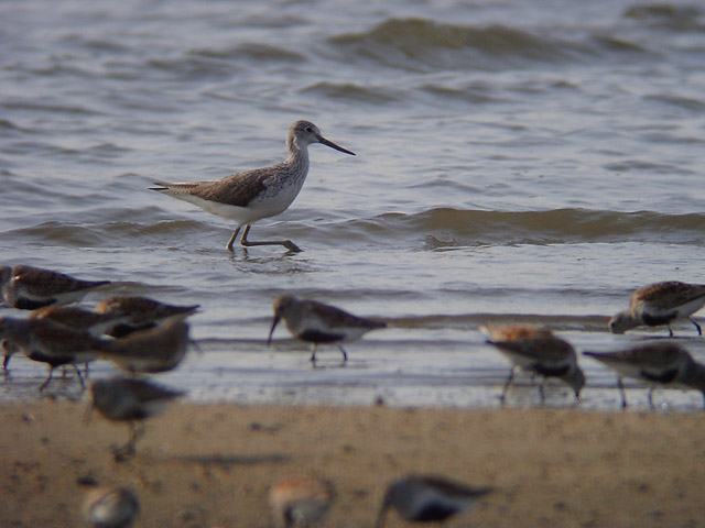 ハマシギたちに長い足を見せつけつつ歩くアオアシシギ。