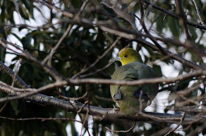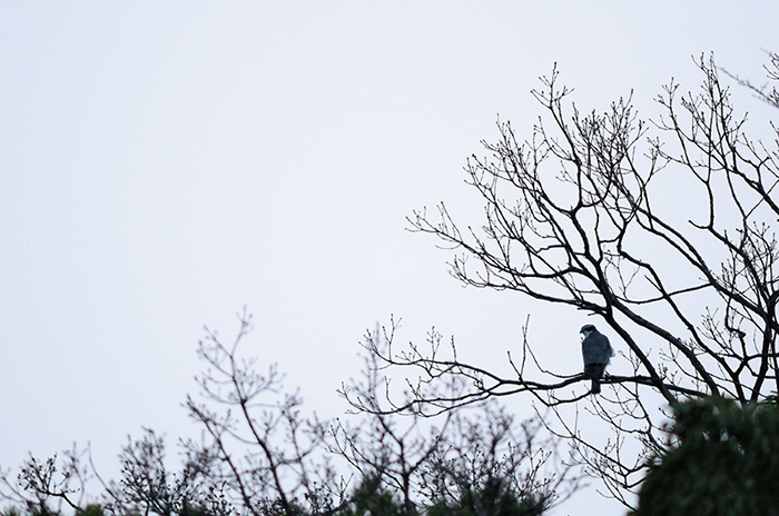 フィールドに着いて朝一番、カメラをセットしてるとすぐ近くの木に飛来した影。